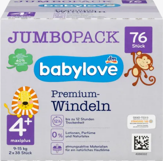 Zobrazit všechny novinkyBABYLOVE Pleny Premium aktiv plus Velikost 4+ maxiplus 9-20kg Jumbo Pack 2x38 76