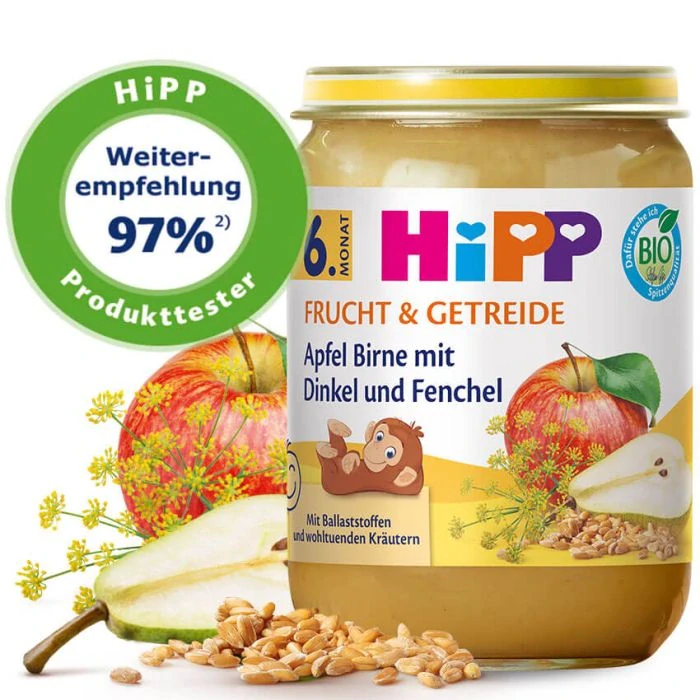 HIPP Bio Jablko hruška se špaldou a feniklem po 6. měs, 190 gSkladem44 Kč/ ks